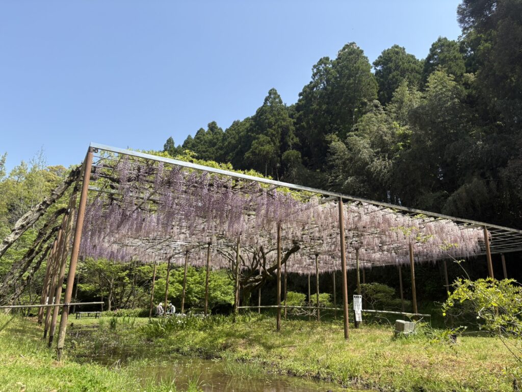 鹿央物産館の里やまでは、4月中旬から5月上旬にかけて、長藤や紫藤、白野田藤、薄紅藤、本紅藤、そして九州では珍しい八重黒龍藤など、多彩な藤が次々と咲き誇ります。